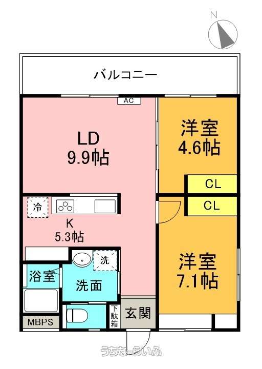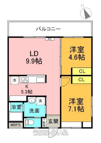 | 間取り | 2LDK ( 洋7.1 洋4.6 LDK15.2 ※専有面積60㎡(18坪)、対面キッチン) | ||