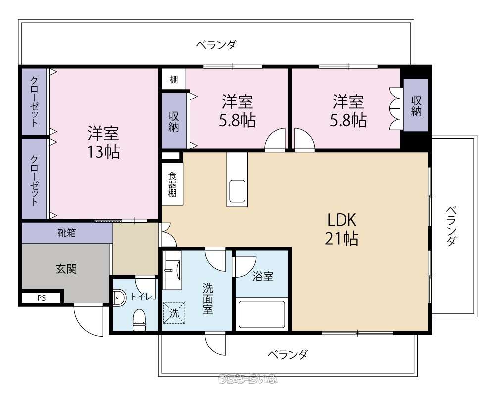 | 間取り | 3LDK ( 洋13 洋5.8 和5.8 LDK21 ※3面ベランダです) | ||