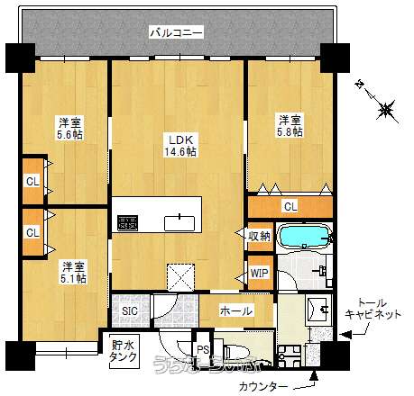 | 間取り | 3LDK ( 洋5.8 洋5.6 洋5.1 LDK14.6 ※バルコニー) | ||