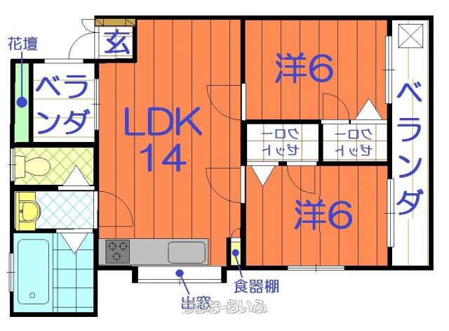 | 間取り | 2LDK ( 洋6 洋6 LDK14) | ||