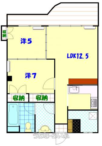 | 間取り | 2LDK ( 洋5 洋7 LDK14.5 ※オール洋間・タイル張り) | ||