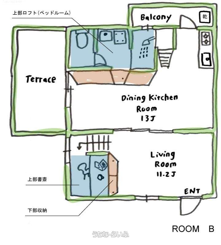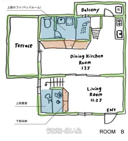 | 間取り | 1DK ( 洋11.2 DK13 ※ロフト(4.15帖)、書斎(2.46帖)、テラスあり) | ||