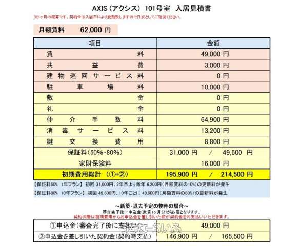 | 料金備考 | 仲介手数料:家賃+駐車料(税別)、保証料:80%(10年更新)、家財保険:16000円(2年)、消毒費用:13200円(税込)、鍵交換費用8800円(税込) | ||