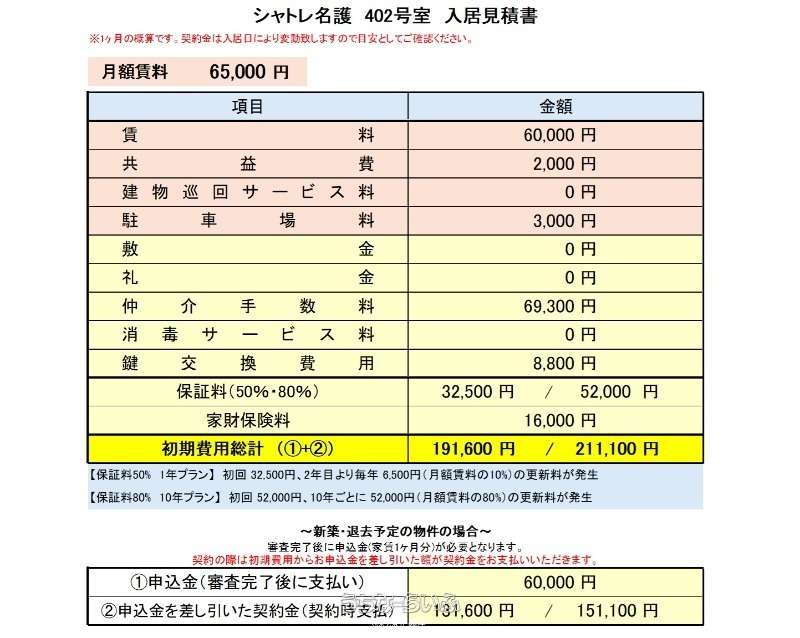 | 料金備考 | 仲介手数料:家賃+駐車料(税別)、保証料:80%(10年更新)、家財保険:22,000円(2年)、鍵交換費用8800円(税込) | ||