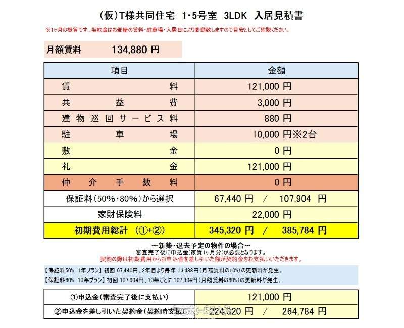 | 料金備考 | 保証料:80%(10年更新)、家財保険:22,000円(2年) 建物巡回サービス:880円(税込)/月 | ||