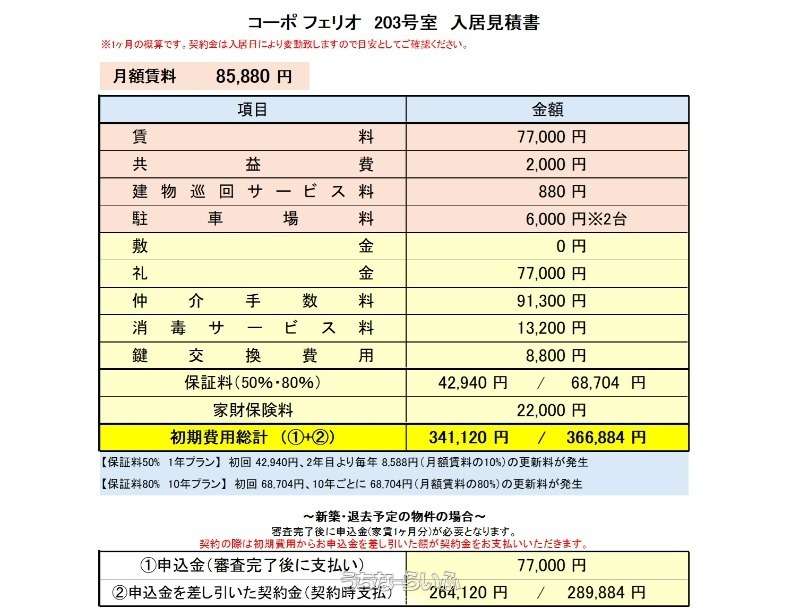 | 料金備考 | 仲介手数料:家賃+駐車料(税別)、保証料:80%(10年更新)、家財保険:22,000円(2年)、消毒費用:13200円(税込)、鍵交換費用8800円(税込) 建物巡回サービス:880円(税込)/月 | ||