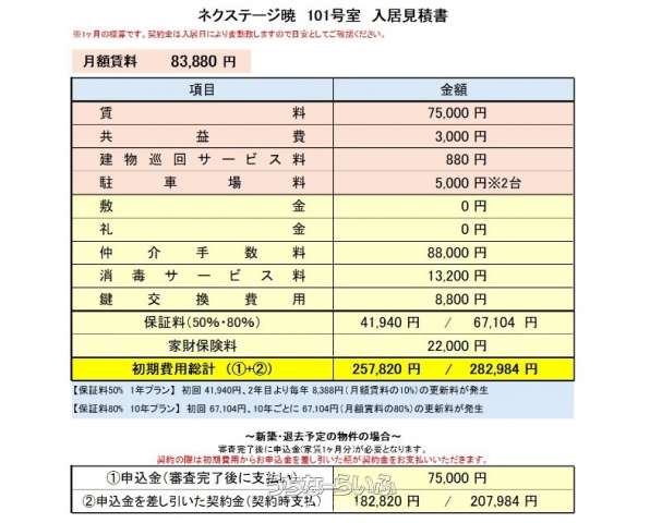 | 料金備考 | 仲介手数料:家賃+駐車料(税別)、保証料:80%(10年更新)、家財保険:22,000円(2年)、消毒費用:13200円(税込)、鍵交換費用8800円(税込) 建物巡回サービス:880円(税込)/月 | ||