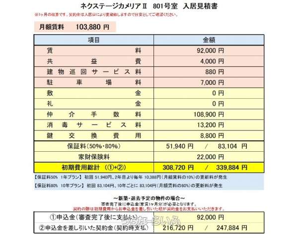 | 料金備考 | 仲介手数料:家賃+駐車料(税別)、保証料:80%(10年更新)、家財保険:22,000円(2年)、消毒費用:13200円(税込)、鍵交換費用8800円(税込) 建物巡回サービス:880円(税込)/月 | ||