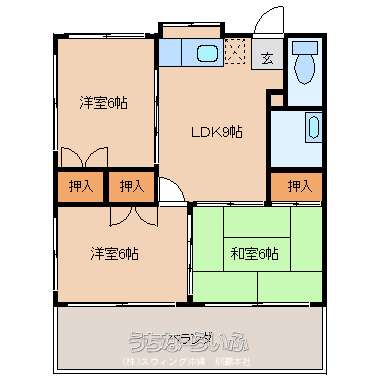 | 間取り | 3DK ( 洋6 洋6 和6 DK9) | ||