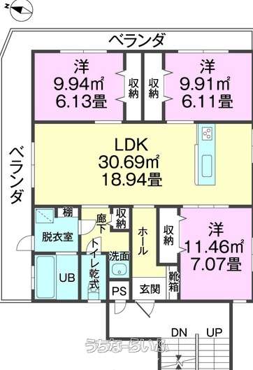 | 間取り | 3LDK ( 洋6.1 洋6.1 洋7 LDK18.9) | ||