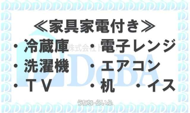 | 家具・家電 | 冷房 、 暖房 、 洗濯機 、 冷蔵庫 、 テレビ 、 家具/家電付き |
