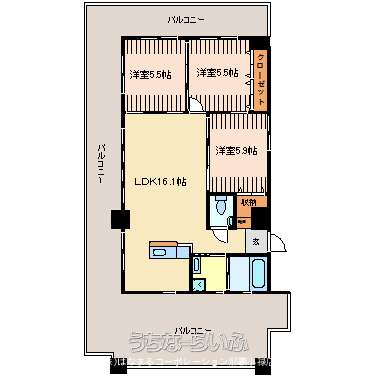 | 間取り | 3LDK ( 洋5.5 洋5.5 洋5.9 LDK16.1 ※3面採光で☆広々バルコニー♪) | ||