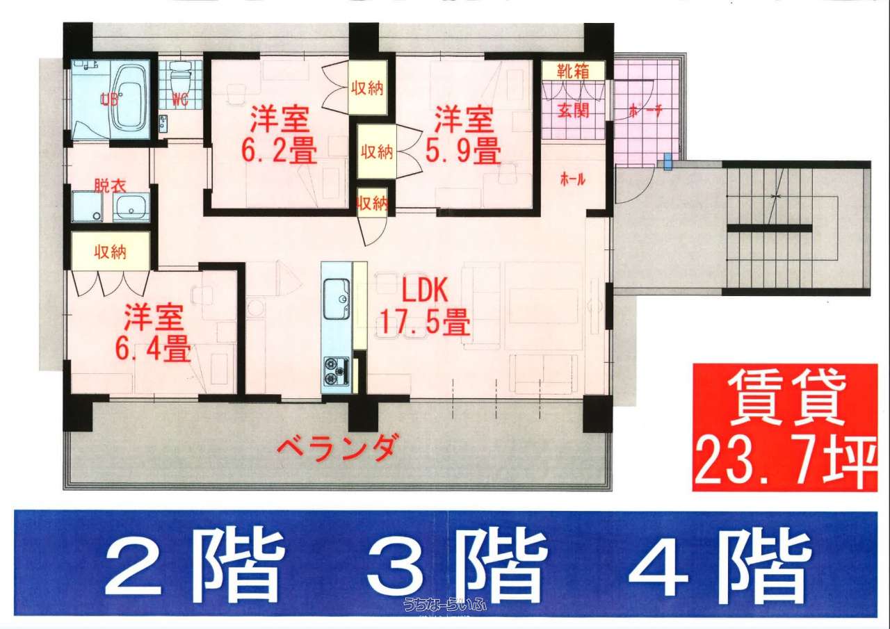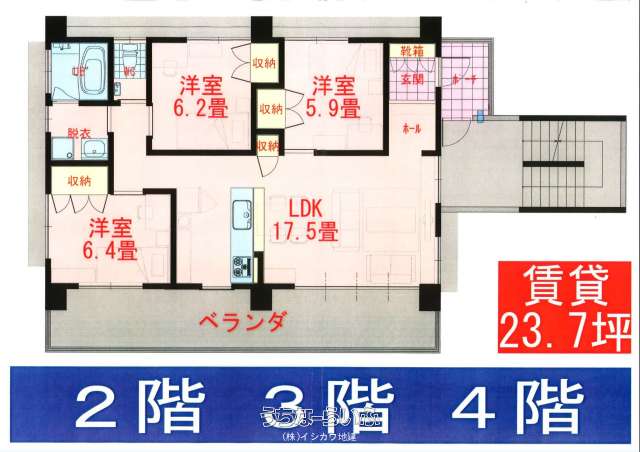 | 間取り | 3LDK ( 洋6.2 洋5.9 洋6.4 LDK17.5) | ||
