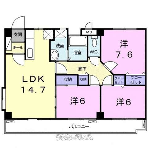 | 間取り | 3LDK ( 洋6 洋7.6 洋6 LDK14.7) | ||