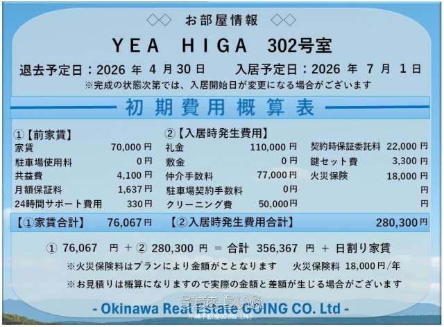 ・「うちなーらいふ」は、より正確な情報の提供を心がけておりますが、物件情報に誤りがある場合は、ご連絡をお願い致します。