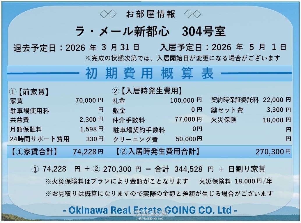 | その他費用 | - | 概算初期費用敷金 + 礼金 + 保証金 + 前家賃(1ヶ月分)+ 前管理賃(共益費1ヶ月分)+ 仲介手数料 + その他費用の合計です。 | - |