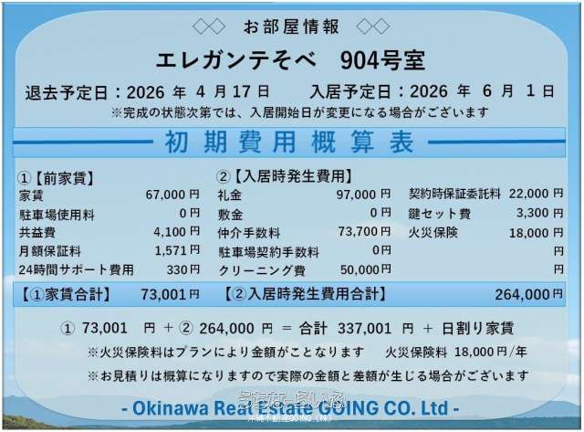 | その他費用 | - | 概算初期費用敷金 + 礼金 + 保証金 + 前家賃(1ヶ月分)+ 前管理賃(共益費1ヶ月分)+ 仲介手数料 + その他費用の合計です。 | - |