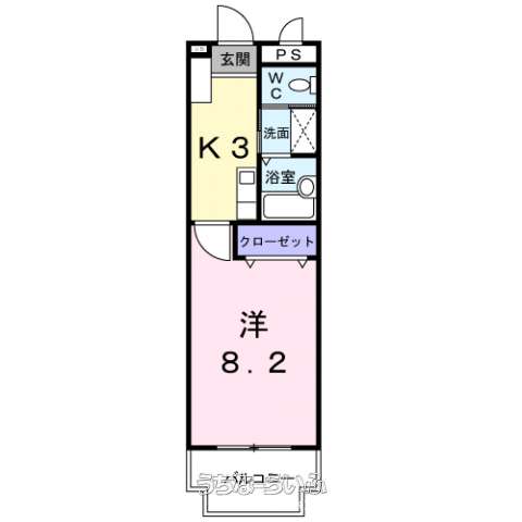 | 間取り | 1K ( 洋8.2 K3 ※室内写真は同タイプ物件写真【方位】南東) | ||