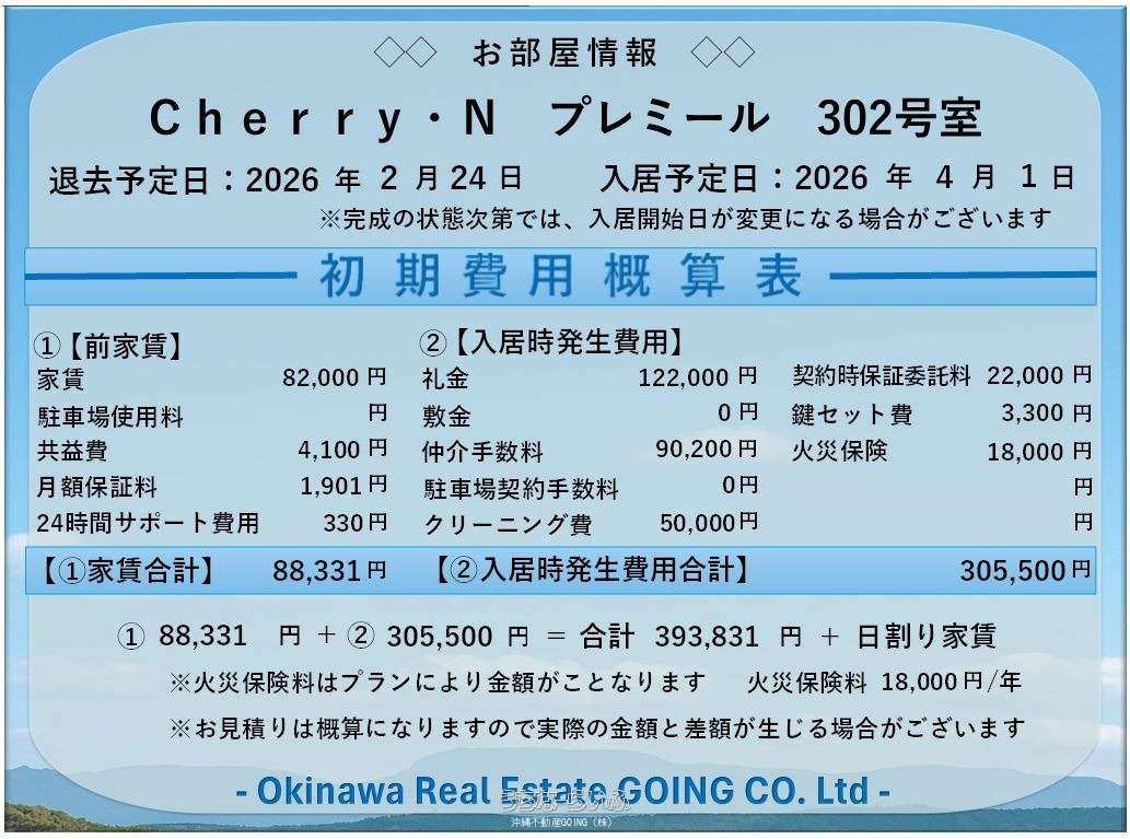 | 料金備考 | 初期費用・毎月の家賃◆クレジットカード◆払いOK!! ・鍵セット費 3,300円 ・定額クリーニング費 50,000円 | ||