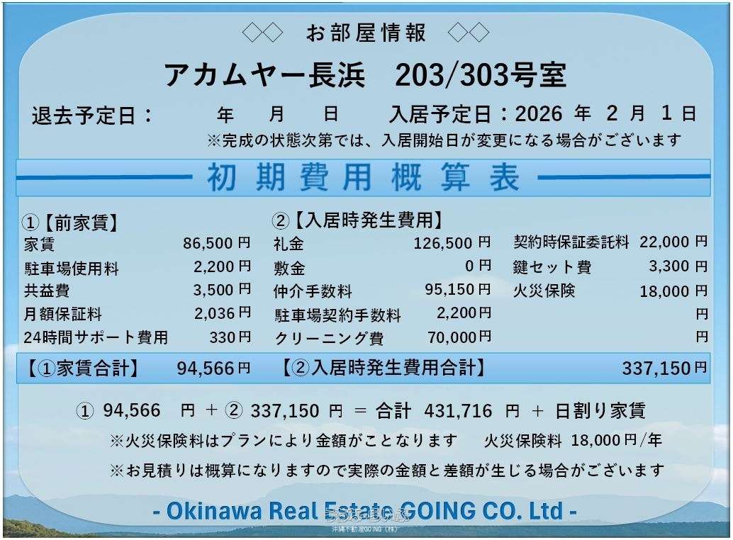 | 物件名 | アカムヤー長浜 | 築年月 | 2026年01月(新築) |