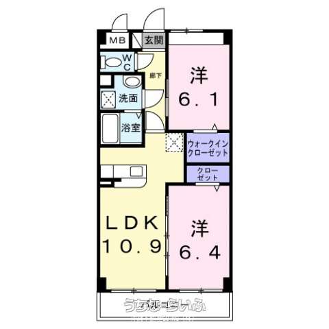 | 間取り | 2LDK ( 洋6.1 洋6.4 LDK10.9 ※室内写真は同タイプ物件写真【方位】南東) | ||