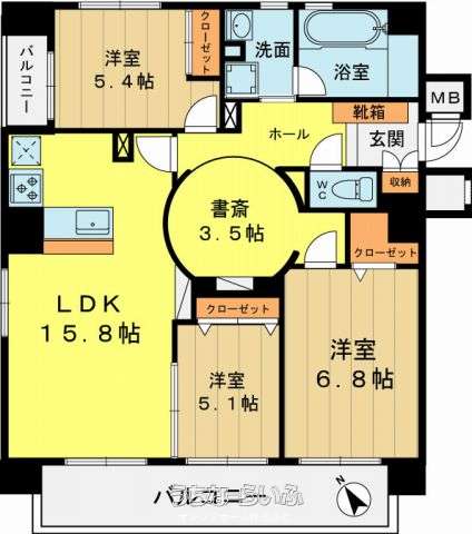 | 間取り | 3LDK ( 洋5.1 洋5.4 洋6.8 LDK15.8 ※書斎3.5帖) | ||