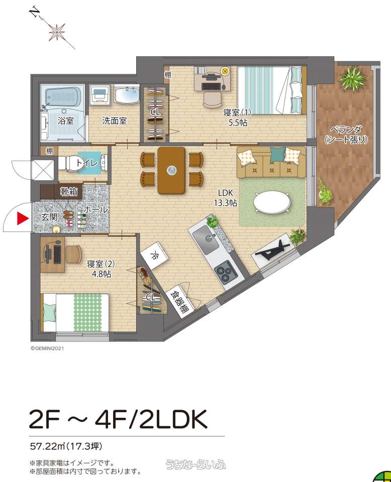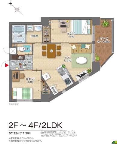 | 間取り | 2LDK ( 洋5.5 洋4.8 LDK13.3 ※ベランダ有り(南東向き)) | ||