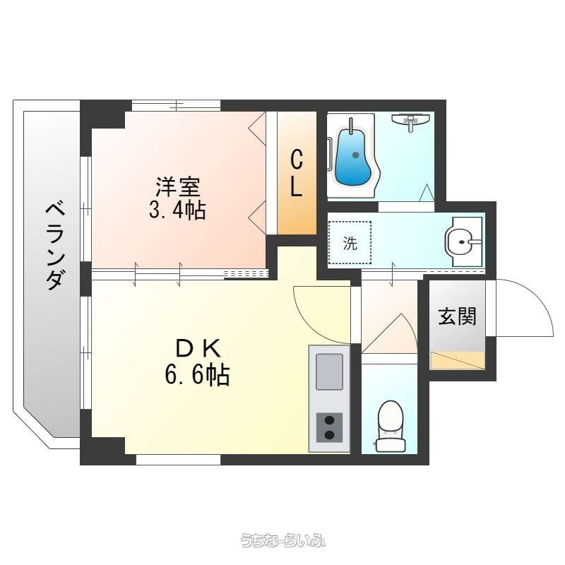 | 間取り | 1DK ( 洋3.4 DK6.6 ※ベランダ有) | ||