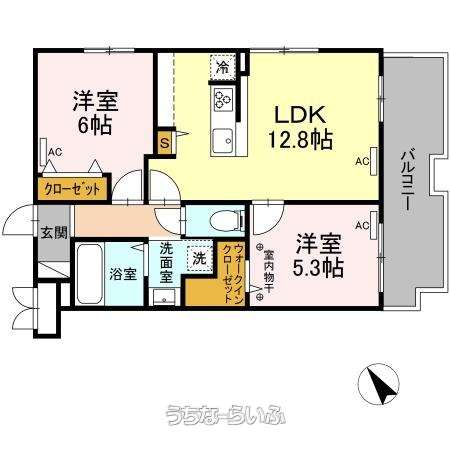 | 間取り | 2LDK ( 洋6 洋5.3 LDK12.8 ※ウォークインクローゼット付) | ||