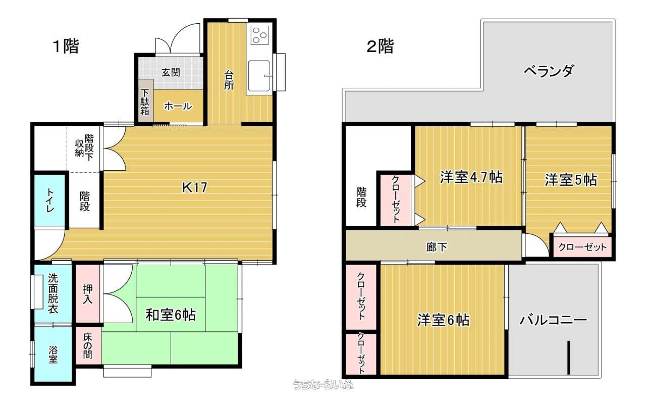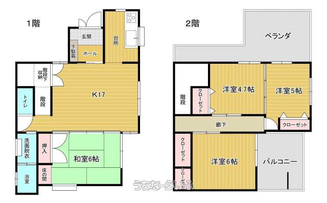 | 間取り | 4LDK ( 洋6 洋5 洋4.7 和6 LDK17 ※1階は和室、2階は洋室です。) | ||