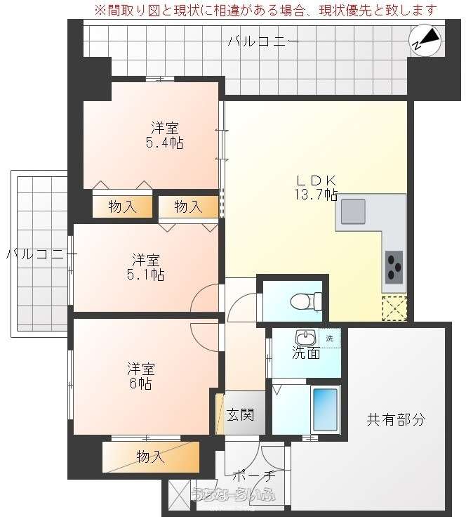 | 間取り | 3LDK ( 洋6 洋5.4 洋5.1 LDK13.7) | ||