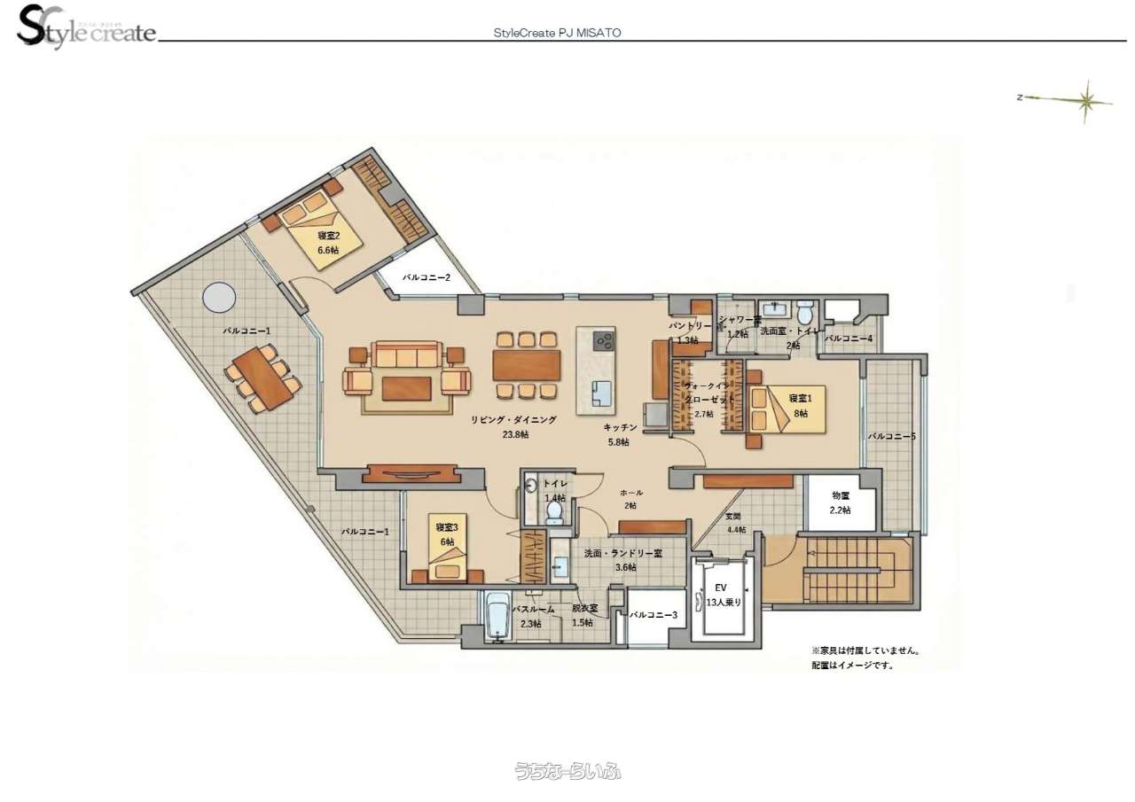 | 間取り | 3SLDK ( 洋8 洋6 洋6.6 SLDK30 ※EVを降りると玄関ホール、ワンフロア1世帯。3SLDK ( 洋8 洋6 洋6.5 LDK30 WIC2.7 洗面室/トイレ2か所 ※バルコニー)) | ||