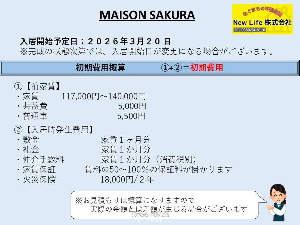 | 備考 | ⭐🌈【お部屋のご内覧について】⭐🌈 ≪新築≫ 建物が完成した後にご内覧可能です。ご内覧が出来るようになる前に満室になることがございますので、気になるお部屋がございましたらお早めのご検討をお勧めいたします(*^^*) ≪築浅・中古≫ お部屋をご内覧してからのお申し込みをお勧めしますが、人気のあるお部屋は、退去前にお申込みが入ることがほとんどです。特に1LDK以上の間取りや、駐車場を確保しているお部屋、築浅物件などは争奪戦になりますので、気になるお部屋がありましたらお早めにお申し込みください(*^^*) ⭐(例)建物名称:MAISON SAKURA♪⭐ 🌸部屋番号:703号室🌸 【前家賃等】・・・① 家賃:140,000円 駐車場使用料:5,500円 共益費:5,000円 月々合計(税込み):150,500円 【入居時発生費用】・・・② 礼金:140,000円 敷金:140,000円 仲介手数料:154,000円 契約時保証委託料:家賃の50%~100% 火災保険料(2年):18,000円 お見積り金額①+②:753,000円+日割り家賃♪ ※目安となりますので、参考にしてください。 ※途中入居の際日割家賃が発生します。 ※ペットがいる際保証金が1か月追加となります。 ※メールでお問合せの際返信にお時間がかかる場合がありますので電話でのお問合せをおすすめ致します。 ※お部屋の内覧は、先着順となりますので内覧後早めの申し込みお願いします。(入居申込希望者最優先) ご見学・資料のご請求・現地のご案内はお電話でスムーズに行えます! 「夢の住まいに一歩ずつ近づくよう私達がサポートいたします!!」 ☆NewLife株式会社☆ 理想の住まい探し、物件探しをサポート ※物件資料とお部屋の現状が異なる場合がございます。その場合お部屋の現状が優先となりますので予めご了承ください。 ※その他、ご不明な点がございましたらお気軽にお問合せ下さい。 ※弊社公式LINEからでもお問い合わせ可能です!!@356ueedyで検索 北部合同庁舎近く!!令和8年3月完成予定・ペット可(条件有) |