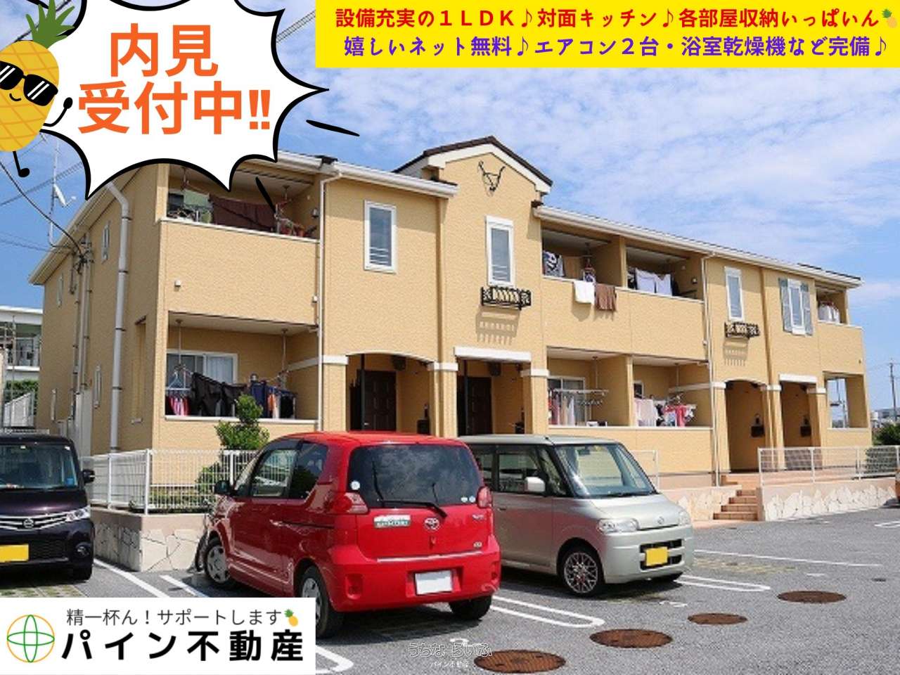 ✨内見受付中✨《1階角部屋♪設備充実1LDK🍍各部屋収納いっぱいん🍍嬉しいネット無料♪対面キッチン♪エアコン2台・浴室乾燥など完備♪》✨初期費用や毎月家賃をクレジット決済OK✨お得にポイントもたまります(◎^^◎)忙しく現地でのご案内が難しく、お時間が取れない方はリモートでのご案内も可能です♪不動産のご相談事は大小関わらずお気軽にお問合せください♪