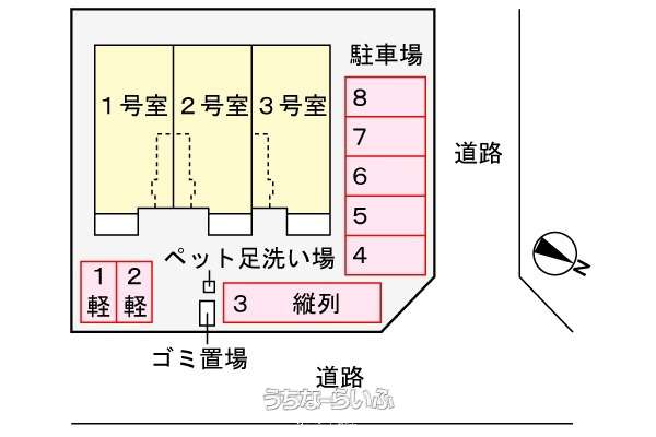 | 駐車場 | 1台3,300円 並列 ※101号室:6番区画、103号室:8番区画 | 交通 | - |