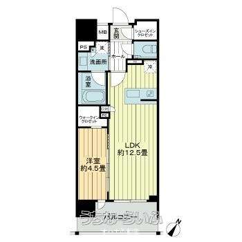 | 間取り | 1LDK ( 洋4.5 LDK12.5 ※その他 玄関(シューズボックス)/洗面脱衣所(洗面化粧台、洗濯機置き場)/浴室(浴室乾燥機)/トイレ/バルコニー) | ||