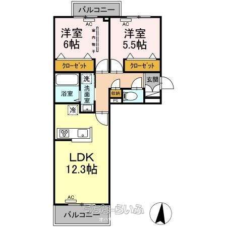| 間取り | 2LDK ( 洋6 洋5.5 LDK12.3 ※その他 玄関(シューズボックス)/洗面脱衣所(洗髪洗面化粧台、洗濯機防水パン)/浴室(追い炊き機能、浴室乾燥機)/トイレ/バルコニー) | ||