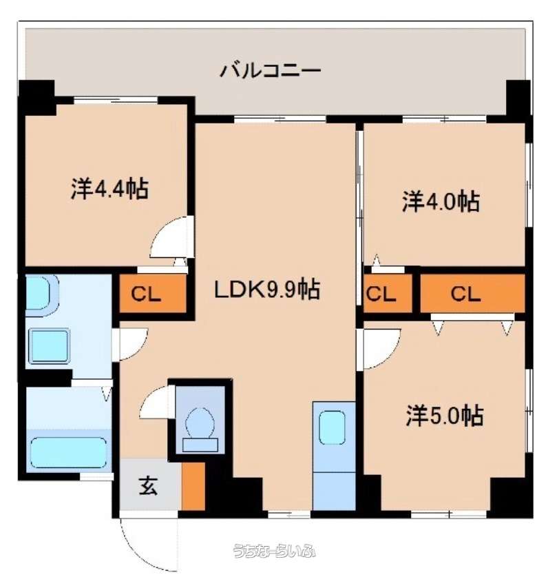 | 間取り | 3LDK ( 洋5 洋4.4 洋4 LDK10 ※間取り図上9.9帖のためDKと表記する場合もあります。) | ||