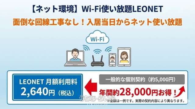 | 設備備考 | バス・トイレ別インターネットLEONET家具・家電付バルコニー駐車場ホームセキュリティ(ALSOK)混合水栓(浴室)駐輪場室内洗濯機置場※写真は一部別なお部屋のものを使用しております |