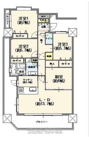 | 間取り | 4LDK ( 洋7 洋5.3 洋5.3 和6 LDK17.1) | ||