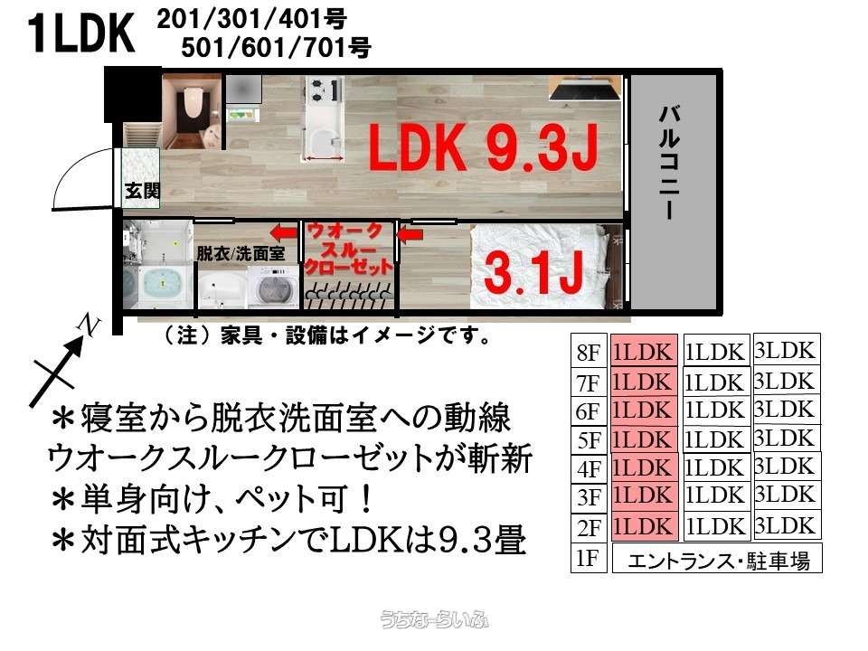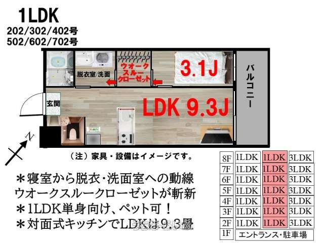 | 間取り | 1LDK ( 洋3.1 LDK9.3 ※洋室と洗面台の間に1.9畳のウオークスルークローゼットがついています。) | ||