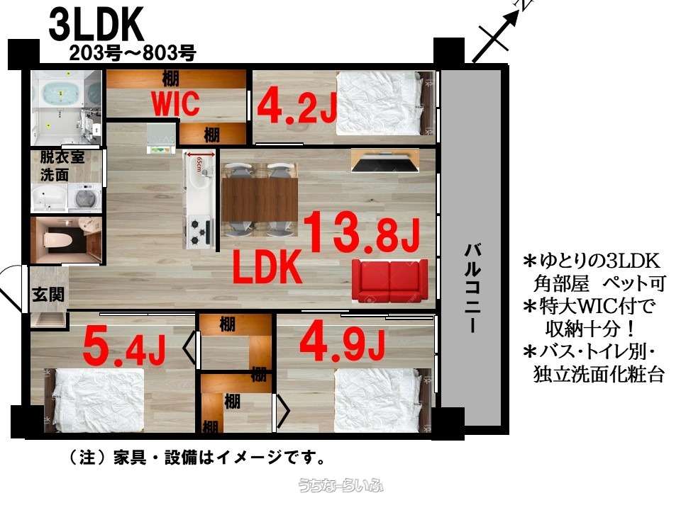| 間取り | 3LDK ( 洋5.4 洋4.9 洋4.2 LDK13.8 ※洋室4.2畳の部屋に2.5畳のWICがついています。洋室はWICの広さを除いた畳数です。) | ||