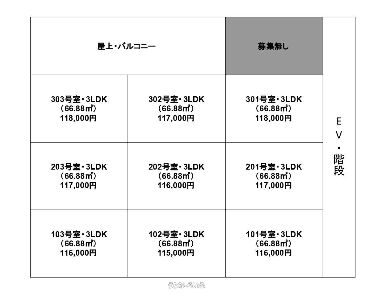 部屋番号 | 202号 | 所在階/階数 | 3階 (4階建) |