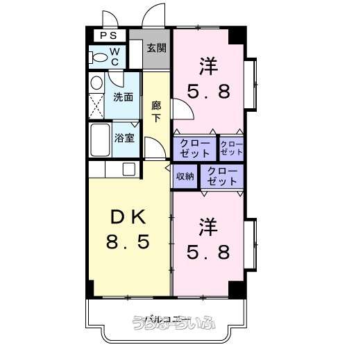 | 間取り | 2DK ( 洋5.8 洋5.8 DK8.5 ※【敷金・礼金0円★】角部屋/出窓・ネット無料・TVインターホン・バストイレ別・洗面化粧台・エアコン・照明付き☆彡) | ||