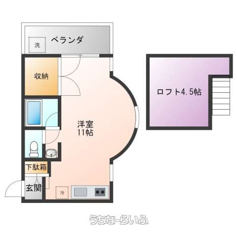 | 間取り | 1ルーム ( 洋11 ※4.5畳のロフトつき) | ||