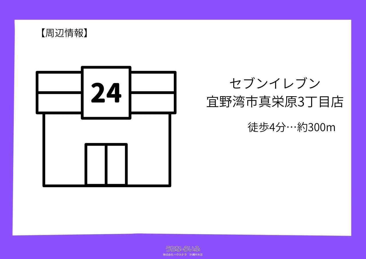 | 備考 | <初期費用概算 詳細>※2カ月分 ●家賃等(合計:143,808円) ・家賃:106,000円 ・共益費:13,000円 ・駐車場使用料:15,400円 ・環境維持費:1,100円 ・インターネット利用料:7,260円 ・事務手数料:1,048円 ※月の途中でご契約の場合、日割りが加算されます。 ●入居時発生費用等(合計:182,680円) ・礼金:53,000円 ・敷金:0円 ・退去時清掃費:41,800円 ・契約時保証委託料:71,380円 ・鍵交換費:16,500円 <近隣情報> ■サンエーV21まえはら食品館(徒歩7分…約550m) ■タウンプラザかねひで沖国大前店(徒歩14分…約950m) ■業務用食品スーパー沖縄本店(徒歩25分…約1900m) ■セブンイレブン宜野湾市真栄原3丁目店(徒歩4分…約300m) <学校区> ■大謝名小学校(徒歩23分…約1500m) ■嘉数中学校(徒歩10分…約700m) |