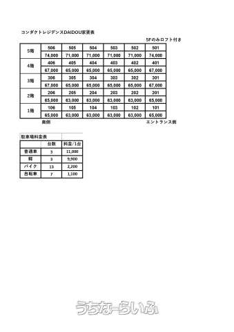 | 料金備考 | 口座振替手数料:330円(毎月) 火災保険料:13,000円~(2年更新) 家賃保証料:31,600円(初回保証料賃料の40%、1年更新時賃料の10%) | ||