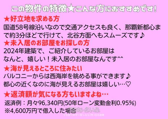 価格変更しました!★☆駐車場2台(無料)付き☆★【8階★角部屋】海が見えるお部屋!!オーシャンビューです(^^)/国道58号線沿い、交通アクセスも良し!那覇新都心まで車で約3分‼新築未入居のお部屋なので即日内覧も可能です\(^o^)/お気軽にお問合せ下さい♪