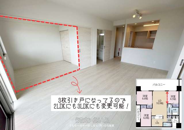 | 間取り | 3LDK ( 洋6.6 洋6 洋4.5 LDK14.7 ※サブバルコニー:約4.03㎡/約1.21坪) | ||