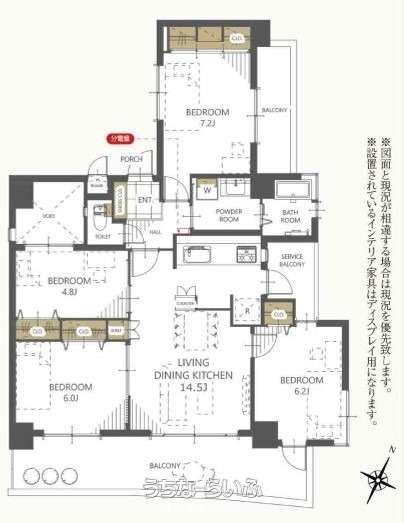 間取り | 4LDK ( 洋7.2 洋6.2 洋6 洋4.8 LDK14.5 ※2面バルコニー、ポーチ面積:1.26㎡ ) | ||